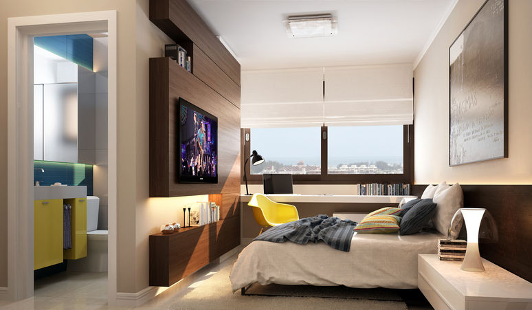 Os dormitórios foram concebidos para serem usados na modalidade solteiro ou casal, com ou sem sanitário tipo suíte, ampliando a flexibilidade de uso.